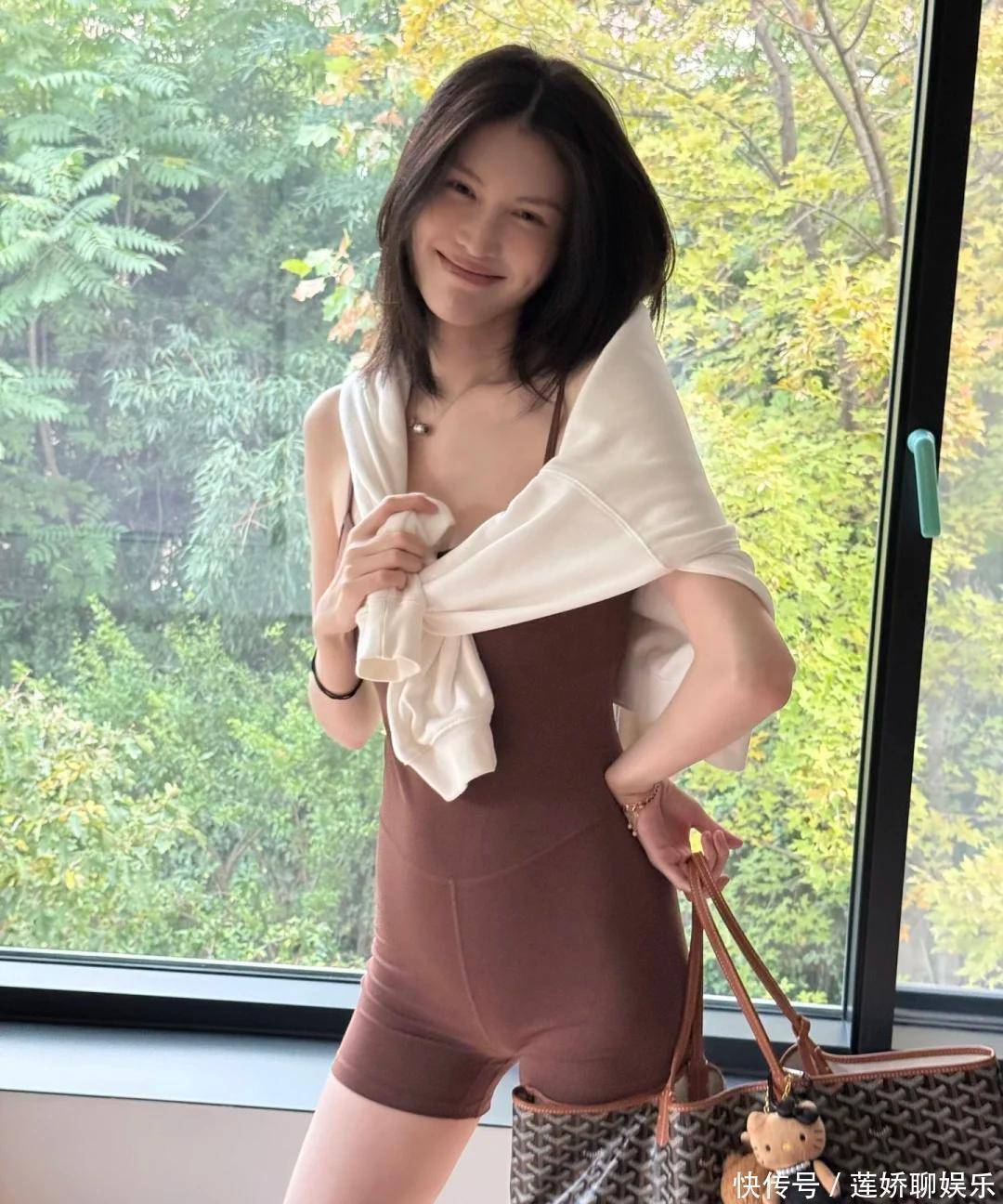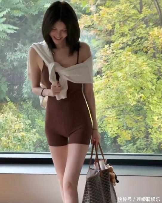 她穿着米咖色瑜伽吊带连体衣,搭配白色外套,直接大秀好身材。